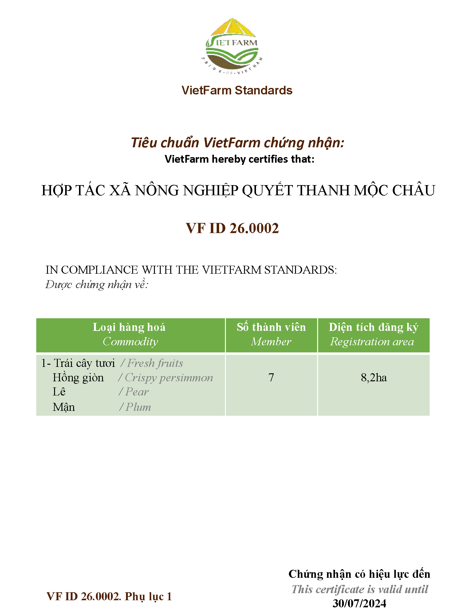 Hợp tác xã Nông nghiệp Quyết Thanh Mộc Châu là một trong những HTX tham gia chuỗi cung ứng nông sản an toàn của tỉnh Sơn La. Được thành lập vào năm 2018 với 7 thành viên, diện tích 8ha, trong quát trình trồng trọt và chế biến HTX luôn tuân thủ các quy định bảo vệ môi trường. Quy trình sản xuất cũng được chuẩn hóa theo quy trình VietGAP, VietFarm nên hạn chế được thuốc trừ sâu và phân bón hóa học, bảo đảm sản xuất đi đôi với phát triển bền vững. HTX còn nuôi ruồi lính đen để xử lý phụ phẩm trong trồng trọt và chế biến tạo nguồn thức ăn cho chăn nuôi và phân hữu cơ cho trồng trọt, các phụ phẩm nông nghiệp được HTX thu gom vào bể và ủ phân hữu cơ bằng mem vi sinh để bón cho cây trồng, cải tạo đất.